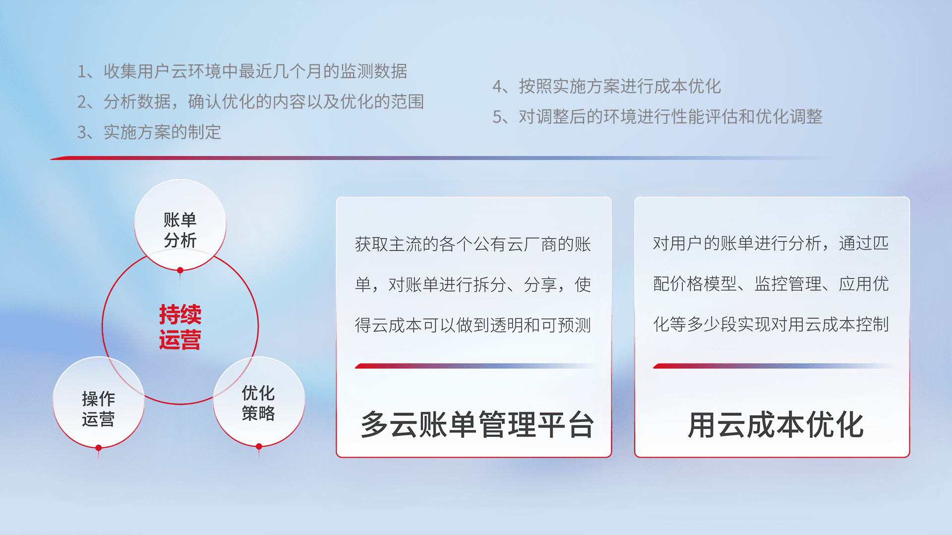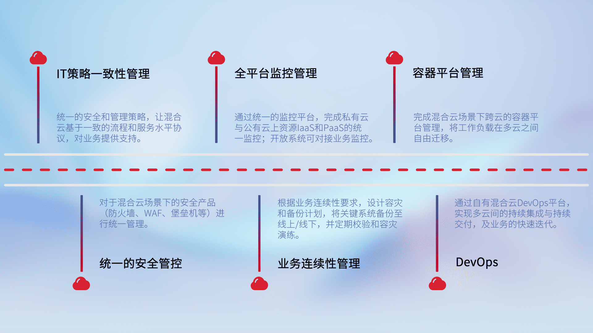 通过多云纳管,,以统一的资源数据模型把客户的云资源进行抽象和封装,,进而实现对多云资源的统一操作,,,,保障云资源管理的可靠性、、、稳定性与可用性。。。量身定制化运维内容,,,,配置、、、、开发运维、、、、补丁管理、、备份、、监控、、、、认证和访问管理、、审计和日常巡检等,,,保障在用云过程中的可靠度,,,,稳定度以及高可用率。。。。